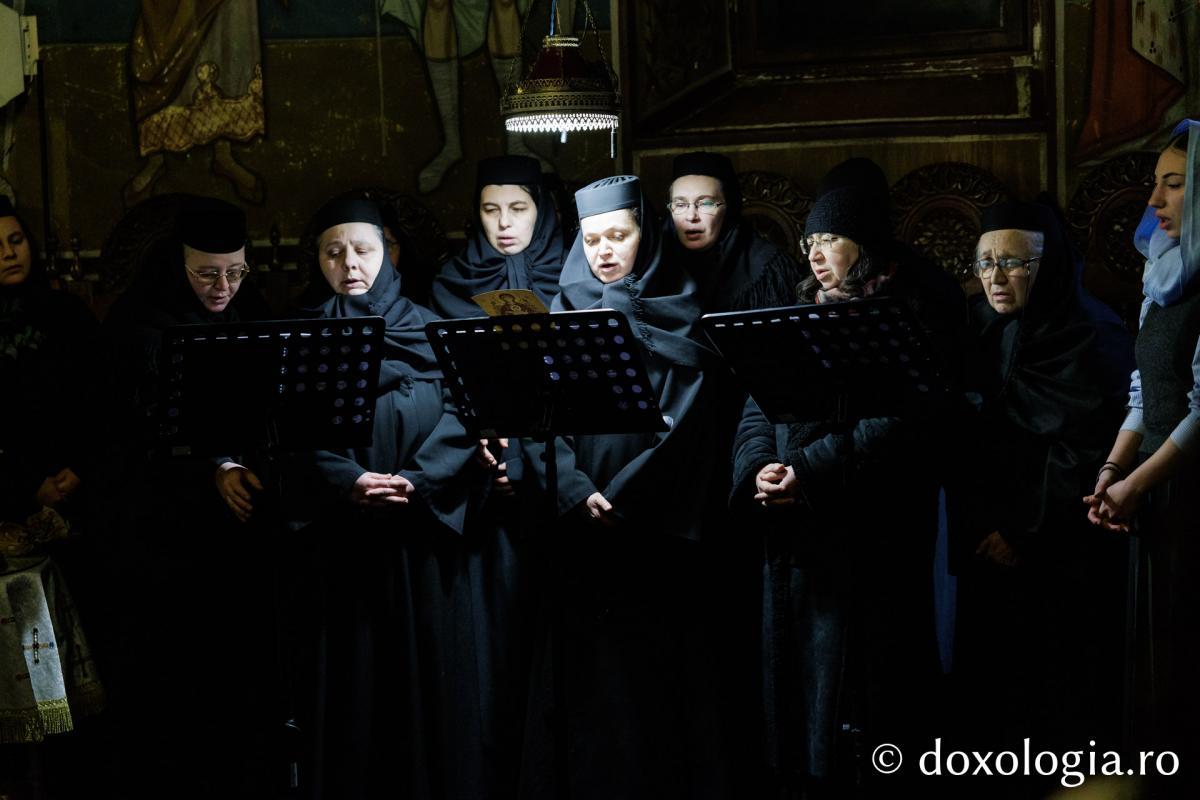 La slujba privegherii a slujit un sobor de preoți și diaconi sub protia părintelui arhimandrit Elisei Nedescu, starețul Mănăstirii „Sfinții Trei Ierarhi” din Iași, iar răspunsurile liturgice au fost date de Corul preoțesc „Apostolii” (în strana dreaptă) și, respectiv, de corul mănăstirii Copou (în strana stângă).